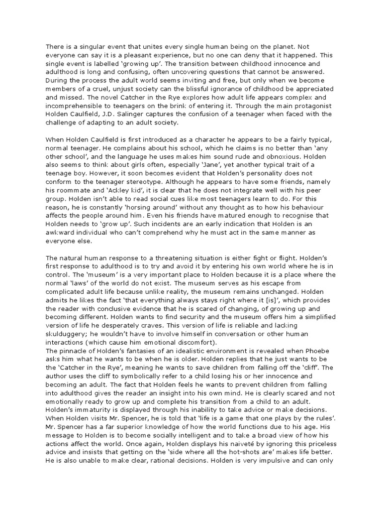Essay About The Catcher in The Rye The Catcher in the Rye by J.D. Salinger heavily probes the theme of sexuality – specifically, Holden Caulfield’s immense turbulence over it. Even the title The Catcher in the Rye originated from Holden’s misinterpretation a sexual poem, hearing ‘if a body meet a body’ as ‘if a body catch a body’ (Salinger ) Summary. Analysis. Characters (8) Essays (30) Quotes () All Books (1) Paper Symbolism plays a big role in the novel “The Catcher in the Rye”. Salinger made placed many of them throughout the novel, but there are 3 big ones that very important to Holden’s character. Holden is a very difficult character to examine, he shows different sides of his personality in almost any situation and rarely describes how Jan 12, · The Catcher in the Rye Analysis Of: “The Catcher In The Rye” January 12, by Essay Writer Holden Caulfield is a very interesting character who describes perfectly how an antisocial wannabe is. He not only expresses his disconformity openly, or at least he expresses it to himself, but also he was not afraid of what other people think of blogger.comted Reading Time: 4 mins